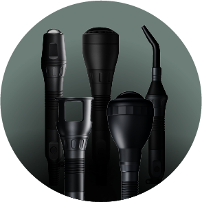 Piezas manuales con distintos cabezales terapéuticos para tratamientos desinflamatorios y de fotobiomodulación en tejidos blandos, que permite adaptar la aplicación a diferentes zonas anatómicas con mayor precisión y versatilidad clínica.